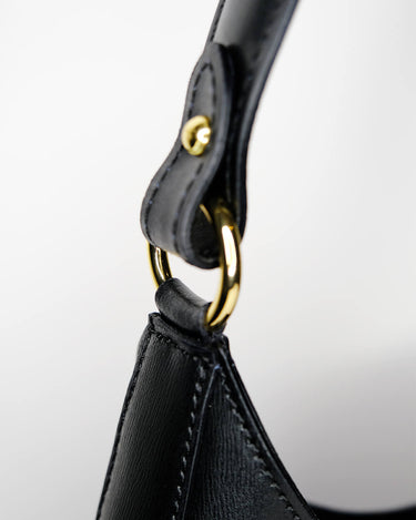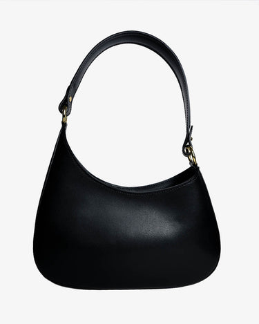 A small leather shoulder bag that features a sculpted half moon shape. It has a leather shoulder strap and zippered closure. It is made in Italy from Italian leather.