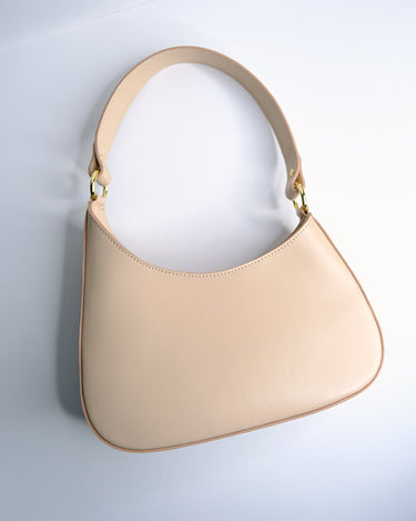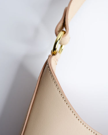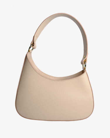 A small leather shoulder bag that features a sculpted half moon shape. It has a leather shoulder strap and zippered closure. It is made in Italy from Italian leather.
