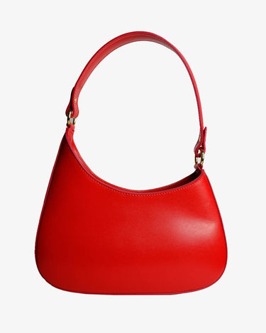 A small leather shoulder bag that features a sculpted half moon shape. It has a leather shoulder strap and zippered closure. It is made in Italy from Italian leather.