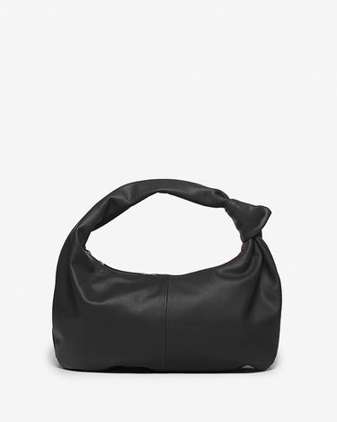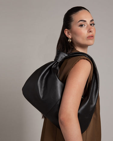 The Vittoria Crescent Knot Bag in Black. Handmade in Florence from soft Italian leather, Vittoria is designed to be both practical and elegant. Its crescent shape sits comfortably on the shoulder, with a sculptural knot detail adding a modern touch. Spacious enough for your daily essentials yet refined in silhouette, Vittoria is a timeless piece made to wear every day.