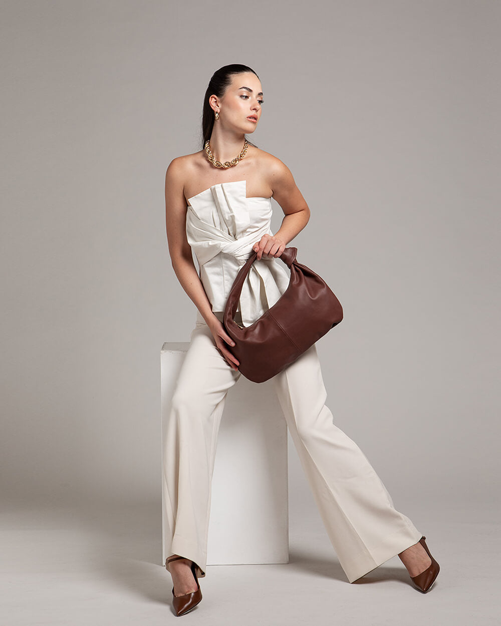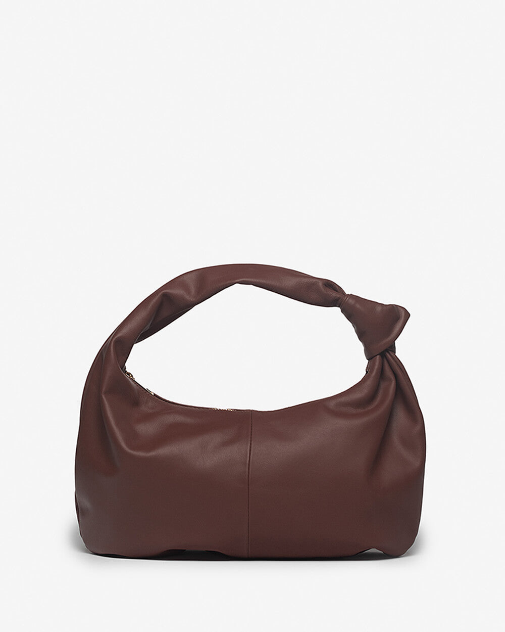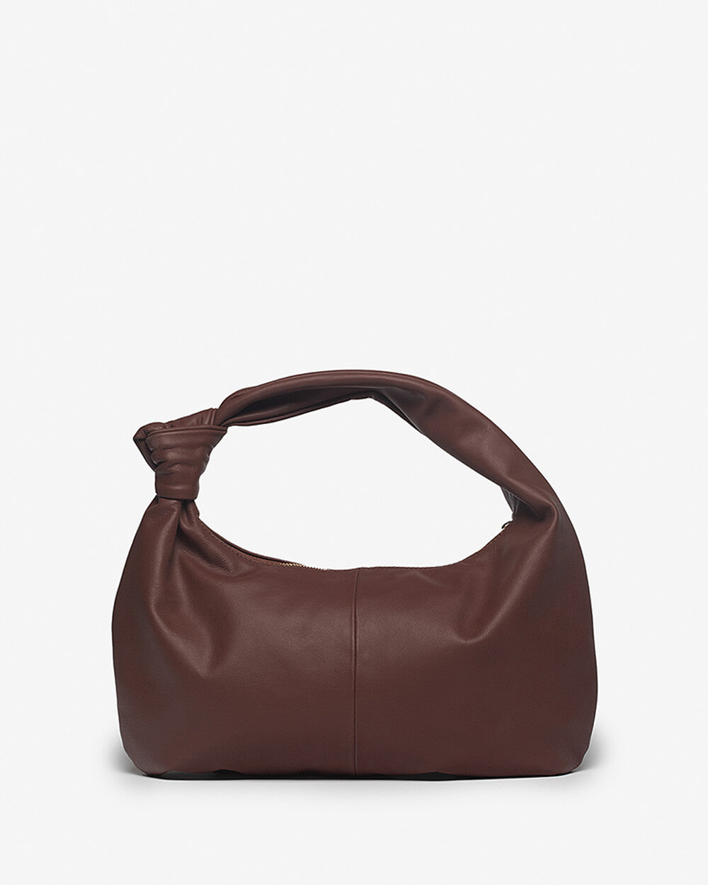The Vittoria Crescent Knot Bag in Mocha Brown. Handmade in Florence from soft Italian leather, Vittoria is designed to be both practical and elegant. Its crescent shape sits comfortably on the shoulder, with a sculptural knot detail adding a modern touch. Spacious enough for your daily essentials yet refined in silhouette, Vittoria is a timeless piece made to wear every day.